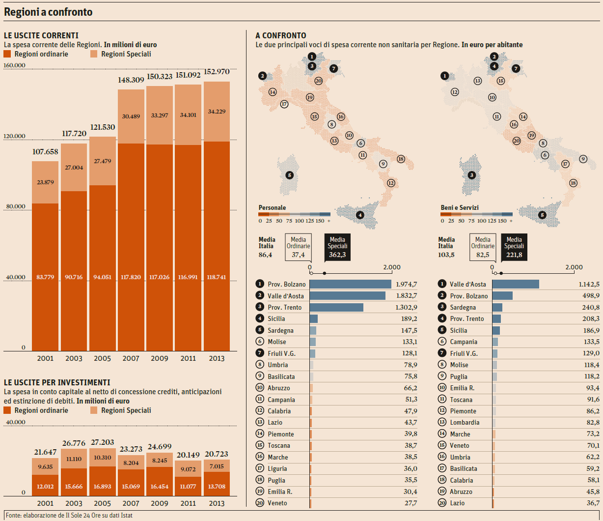 La spesa corrente delle regioni è passata da 107.658 milioni nel 2001 a 152.970 milioni nel 2013. Gran parte delle spese regionali sono legate a personale e servizi: la spesa media italiana pro capite per il personale è di 86,4 euro e per i servizi è di 103,4 euro (media decisamente innalzata dalle spese delle regioni a statuto speciale). Particolarmente alte le spese della Sicilia per il personale (quasi 200 euro ad amministrato) superate solo dalle spese delle piccole Autonomie del Nord (Valle d’Aosta, Prov. di Trento e Prov. di Bolzano) che però svolgono anche funzioni statali, con meccanismi finanziati quasi totalmente dalle tasse che rimangono sul territorio.