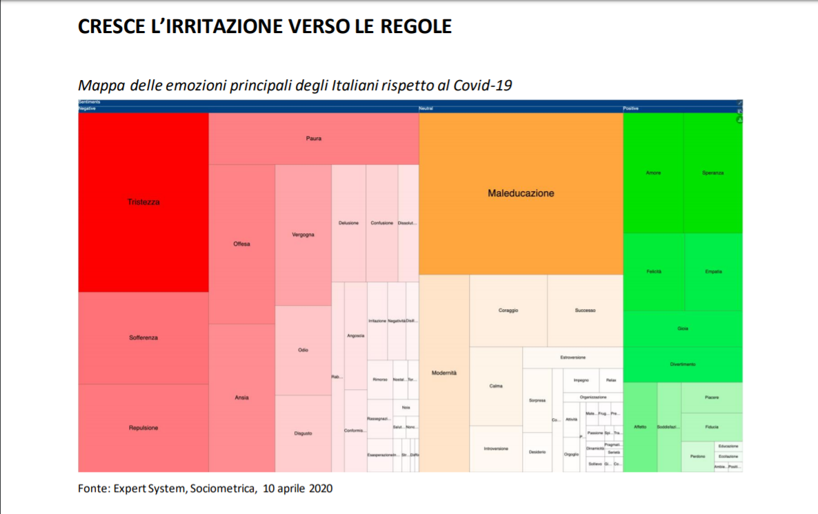 1 aprile 2020. Dopo alcuni giorni in cui il quadro emozionale del Paese era fisso, immobile, senza cambiamenti e dominato dalla tristezza, per la prima volta da quando è scoppiata l’epidemia del coronavirus non c’è in testa un sentimento negativo: era stata l’ansia prima, poi la paura e infine la tristezza. Oggi domina un sentimento che nella scala emotiva è considerato “neutro” e che nella mappa è indicato come “maleducazione”, con un’accezione molto ampia del termine. Da un lato molti si lamentano di come le prescrizioni governative non siano adeguatamente osservate dalla gente, perciò ne rimproverano i comportamenti, giudicandoli come poco educati e non rispettosi delle norme e del comportamento civile; dall’altro, molti si lamentano invece della confusione causata dal non riuscire a capire con precisione ciò che la legge consente e quello con consente.