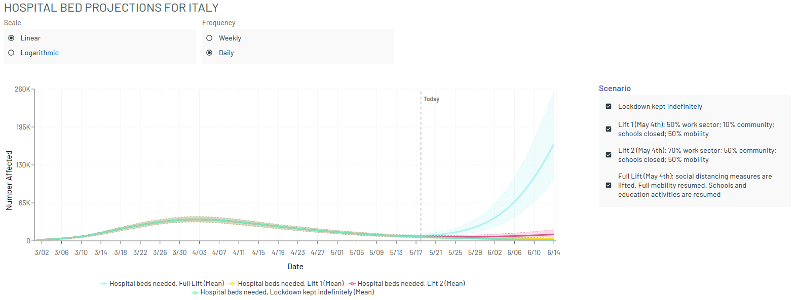 Gli scenari disegnati dal modello prevedono quattro ipotesi diverse: intanto che il lockdown venga mantenuto ancora per diverso tempo; che ci sia una modesta riapertura di imprese, scuole e movimento delle persone; una riapertura ancora più incisiva e infine un pieno ritorno alla situazione precedente – pur con il virus ancora in circolo.