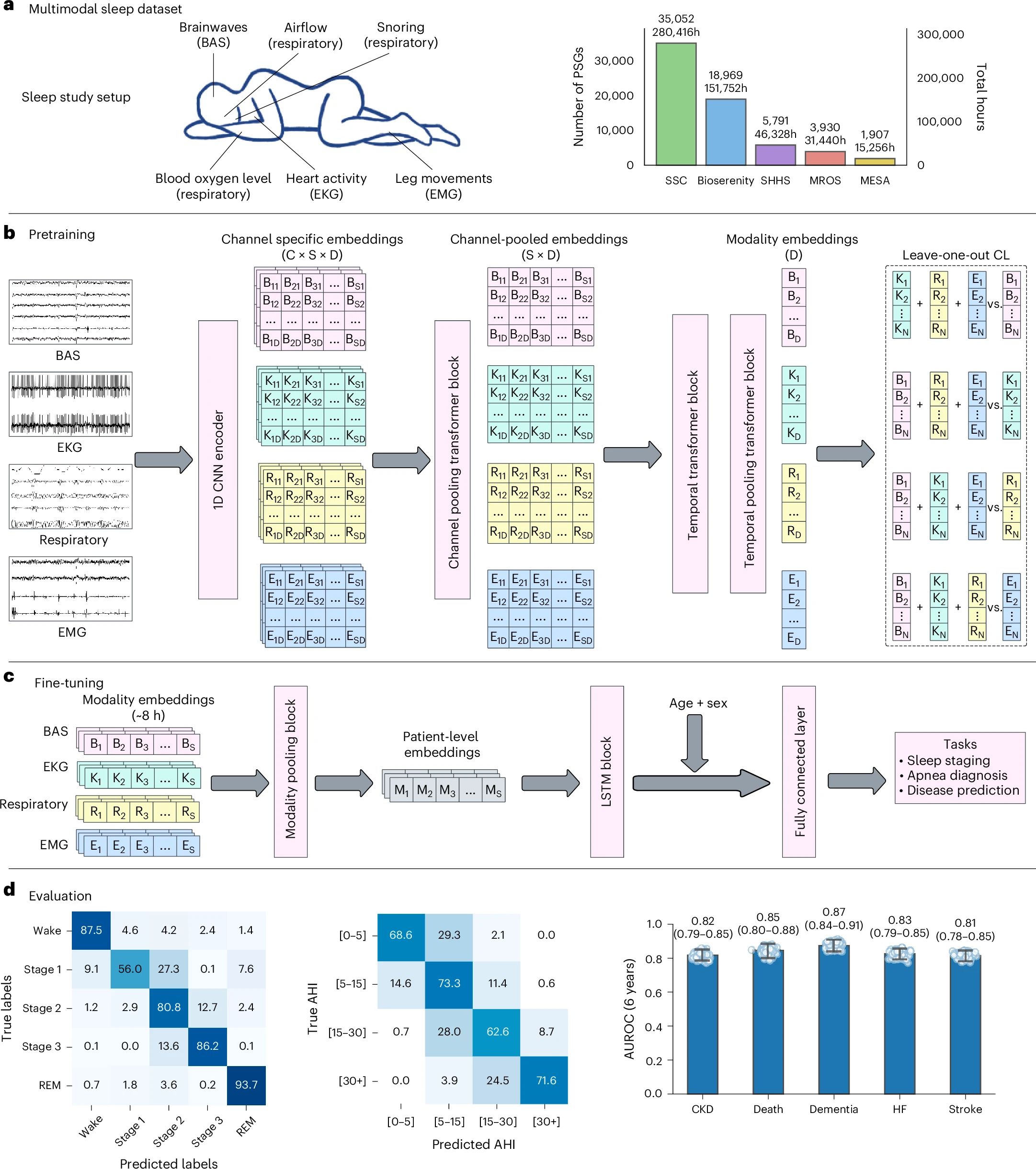 SleepFM è stato addestrato su quasi seicentomila ore di dati raccolti da 65.000 partecipanti in 25 anni, tra il 1999 e il 2024, con una combinazione di dati e cartelle cliniche elettroniche. Il modello analizza i dati segmentandoli in unità di cinque secondi, come se fossero parole in un testo, e impara le relazioni tra i diversi segnali fisiologici, creando una sorta di linguaggio del sonno. In questo modo, non solo è in grado di classificare le fasi del sonno o diagnosticare l’apnea notturna, ma può anche identificare anomalie che anticipano il rischio di malattie future.