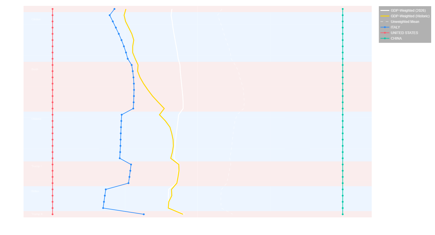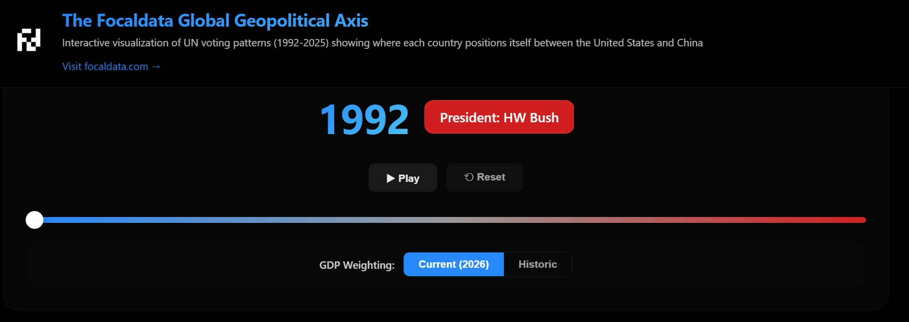 La posizione mostra l’allineamento dei voti su una scala USA (-1)/Cina (+1) basata sulla correlazione ponderata dei voti ONU. I colori variano dal blu scuro (allineamento USA) al grigio (neutro) fino al rosso scuro (allineamento Cina). La linea bianca continua mostra la media ponderata del PIL (selezionabile tra il PIL attuale del 2026 o il PIL storico per anno), mentre la linea bianca tratteggiata mostra la media non ponderata (ogni Paese è uguale). Passa il mouse sui punti per i dettagli del Paese. Si può utilizzare il cursore o il pulsante di riproduzione per vedere come gli allineamenti cambiano nel tempo.