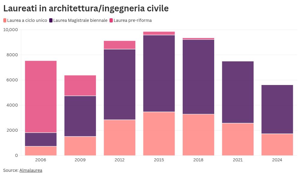 Ma già dal 2015 la tendenza si inverte. Il totale scende a 9.851, poi a 9.345 nel 2018, 7.492 nel 2021 e un preoccupante 5.608 nel 2024. In dodici anni, il numero di laureati in Architettura o ingegneria civile si è ridotto del 38,5%. Una contrazione senza precedenti nelle serie storiche del settore.