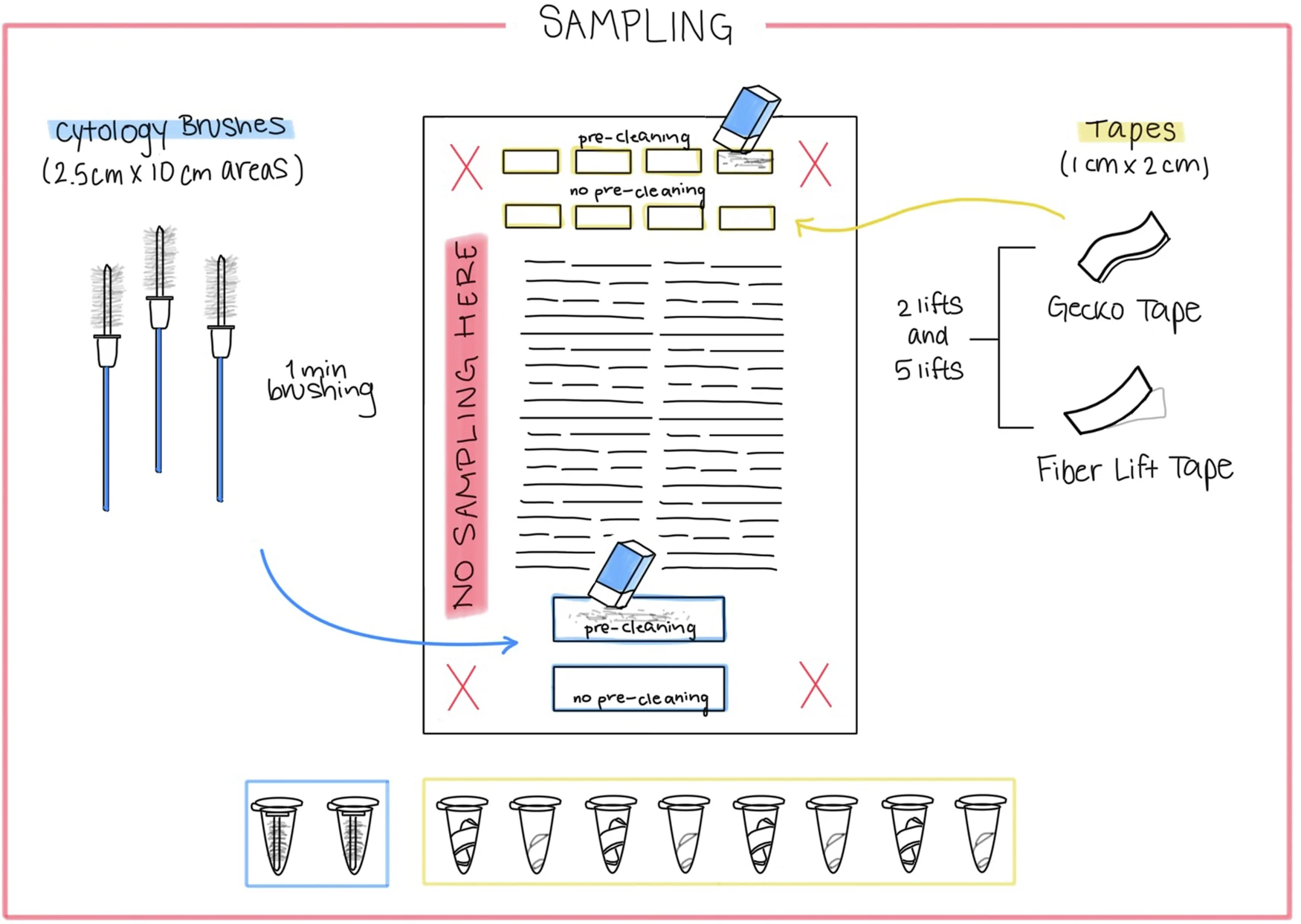 Per la raccolta di materiale cellulare da un’area di circa 2,5 cm per 10 cm (“aree più ampie”) sono stati utilizzati pennelli citologici, sia con che senza pre-pulizia con gomma. Inoltre, sono stati valutati due tipi di nastro adesivo: il nastro Gecko e il nastro adesivo forense in fibra. I campioni sono stati raccolti da un’area di circa 1,5 cm per 2,5 cm (“aree più piccole”) con entrambi i tipi di nastro, utilizzando due e cinque passaggi. Anche i campioni di nastro sono stati raccolti sia con che senza pre-pulizia con gomma. Per il campionamento sono state prese di mira aree non testuali e aree non frequentemente toccate.